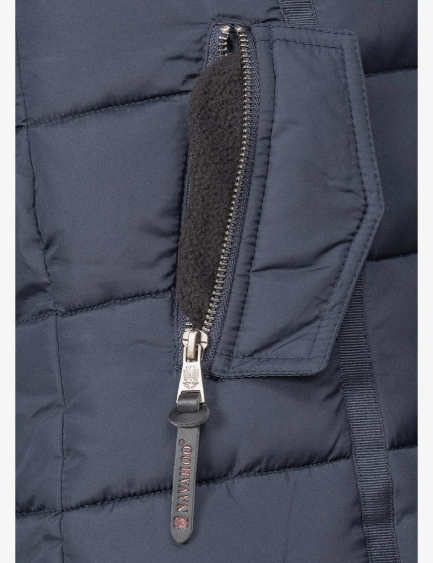 Couleur unieDoudoune matelasséeCapuche avec fausse fourrure amovibleCoupe cintréeFermeture éclair masquéePartie dorsale allongéePoche intérieurePoche à rabat / à pattePoches latérales avec fermeture éclairEtiquette patch / étiquette flagPiqûres de finitionsCoutures ton sur tonTissu robusteDoublure chaudeFermeture à glissière