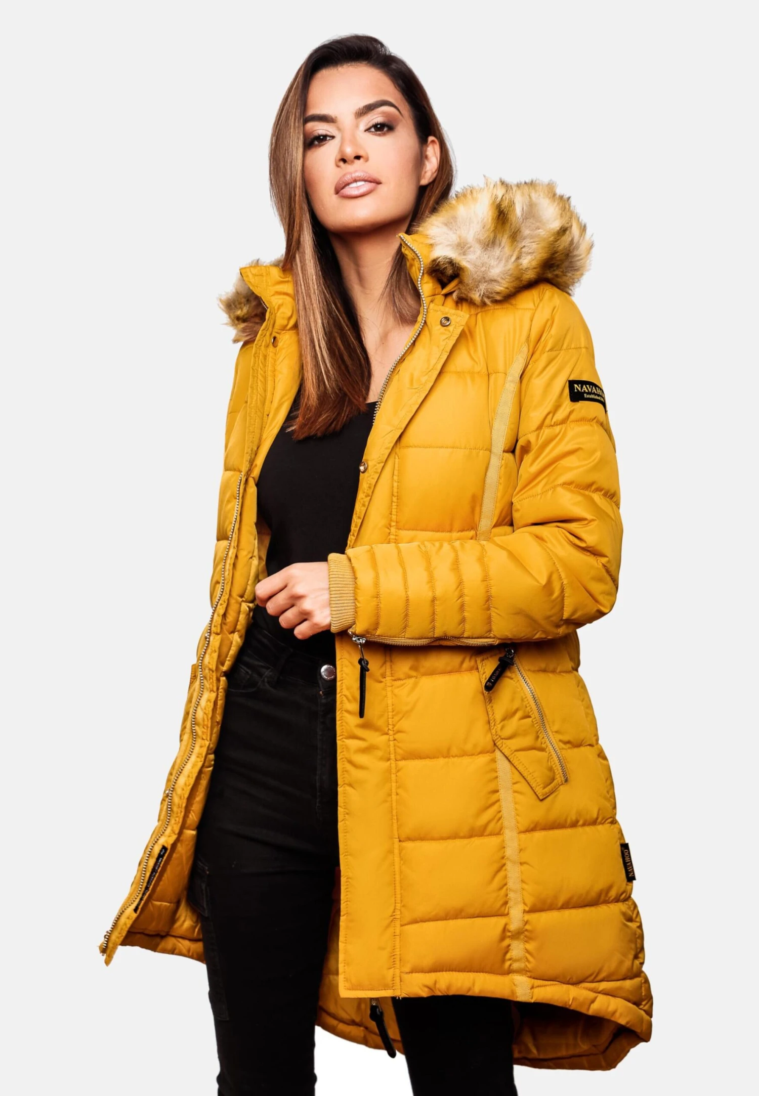 Couleur unieDoudoune matelasséeFermeture éclairCapuche avec fausse fourrure amovibleFermeture éclair masquéePoches latérales avec fermeture éclairEtiquette patch / étiquette flagPiqûres de finitionsCoutures ton sur tonTissu lisseDoublure chaudeFermeture à glissière
