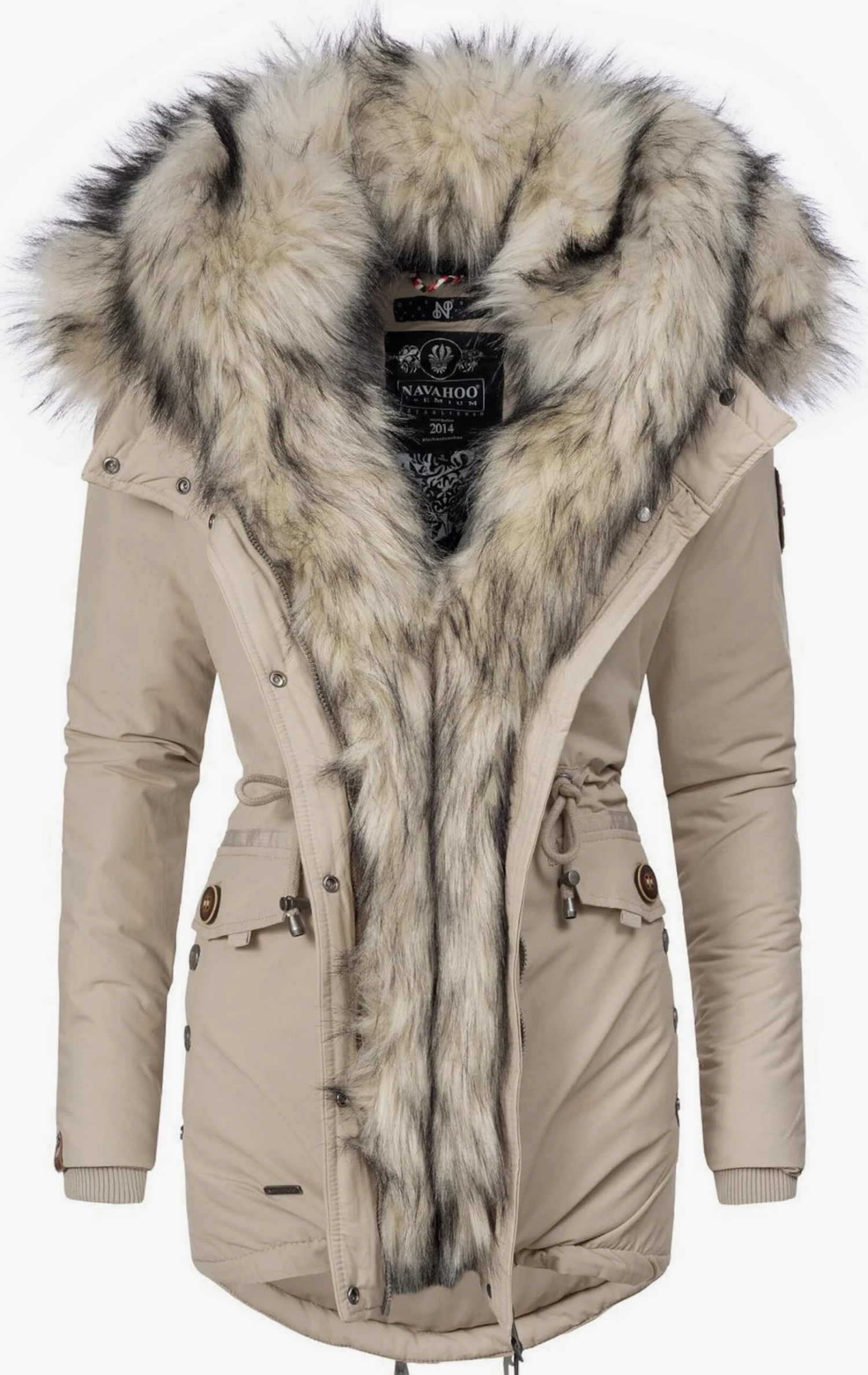 Couleur unieCapuche détachableBoutonnière avec boutons pressionCapuche avec fausse fourrure amovibleBord côteléFermeture à glissière dorsaleCoupe cintréeFermeture éclair masquéePartie dorsale allongéePoche intérieurePoche à rabat / à pattePoches latéralesLabel PlateCordon de serrage tailleEtiquette patch / étiquette flagétancheOeillets métalliquesDoublure chaude